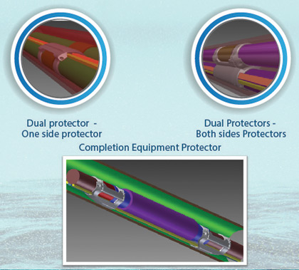 Downhole Cable Protector![]() In the completions applications, cable protector is used to maintain the downhole cable integrity for Permanent Downhole Gauge, Surface Controlled Substructure Safety Valve, Chemical Injection Valve, Electrical Submersible Pump and Intelligent or Smart Well System. Petroclamp cable protector offers the well-engineered downhole cable protection system for all the downhole cable applications either in the single or dual completions system. The protectors are designed and built to ensure that all control lines and cables are protected for the full length of the production string in the completions. Petroclamp protectors extend the run life, functionality and operability of all downhole equipment by protecting downhole cable from crushing or abrasive forces during installation of the completion string. Without this protection, damage to the control line and cable can lead to premature malfunction or failure of the completion. Continual design evolution of these protectors ensures that installation and removal of the protectors is simple and quick. When used with a pneumatic installation kit and installed in approximately 20 seconds. The fastening mechanism is self-locating, which minimizes the potential for thread damage.